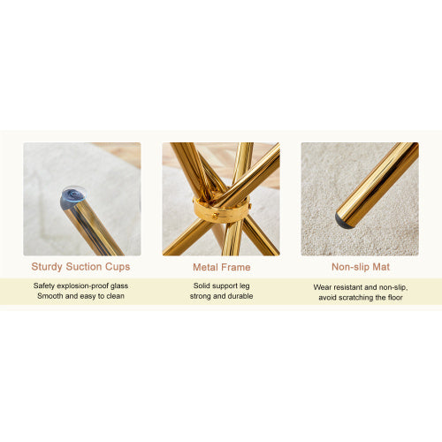 Round clear glass dining table with a unique shape for 4-6 people, ring-shaped gold metal legs, suitable for desks, kitchens, terraces, dining rooms.